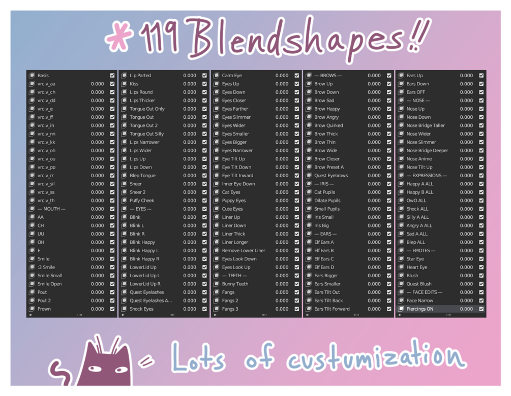 ♥─ 119 Blendshapes (Excluding visemes, organizer shapekeys)