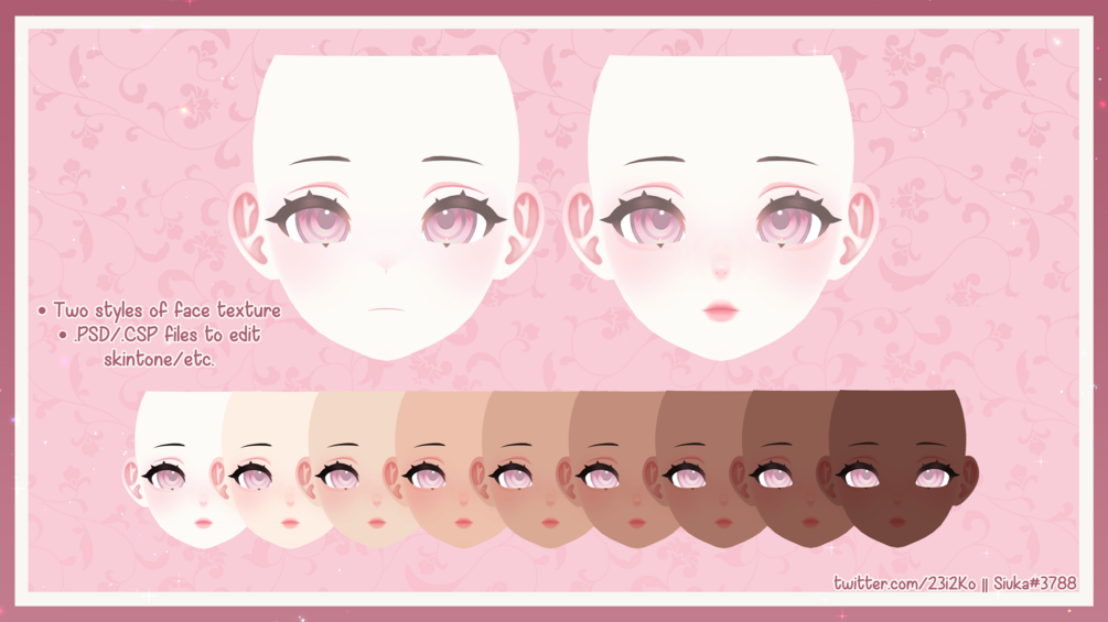 Second head woo!! This is an improved version of the very first head I ever made from scratch+used on personal avatars (some pics of it here for ref: https://twitter.com/23i2Ko/status/1526720631324266496), which was never publicized. The blendshapes for the mouth and eyes are much more in-depth, with general all-over improvements to anatomy and topology so it looks better from different angles. Compared to the Lilie head, this head also has slightly better topology, and a ton more blendshapes so the face is SUPER customizable. I also wanted to include a better way to edit textures + include makeup, so this one comes with Photoshop and Clip Studio Paint files, as well as emission maps.