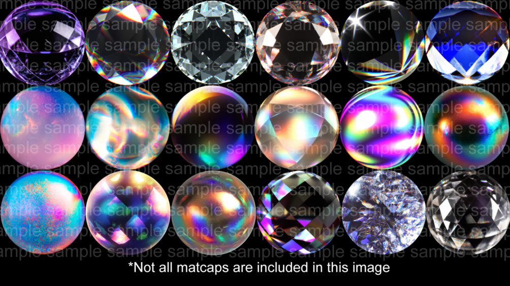 I used Poiyomi to create all the images/gifs of objects using these matcaps. Since Poiyomi has the option to apply two matcaps to one material, I suggest using that feature to 'stack' the matcaps to make really pretty combinations!!